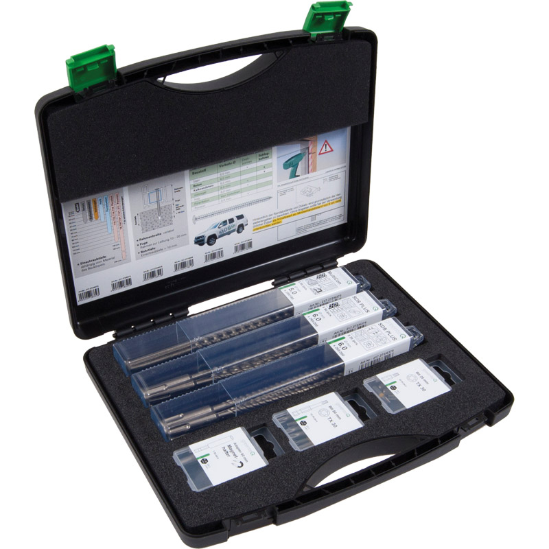 Der greenteQ Fenster-Montage Koffer ist die ideale Lösung für den Einbau von Fenstern und Außentüren. Der Koffer beinhaltet alle notwendigen Bohrer und Bits für die gängigsten Untergründe. Darüber hinaus ist eine übersichtliche Anleitung der erforderlichen Bohrdurchmesser und Bohrtiefen in Bezug auf den jeweiligen Baukörper dargestellt.